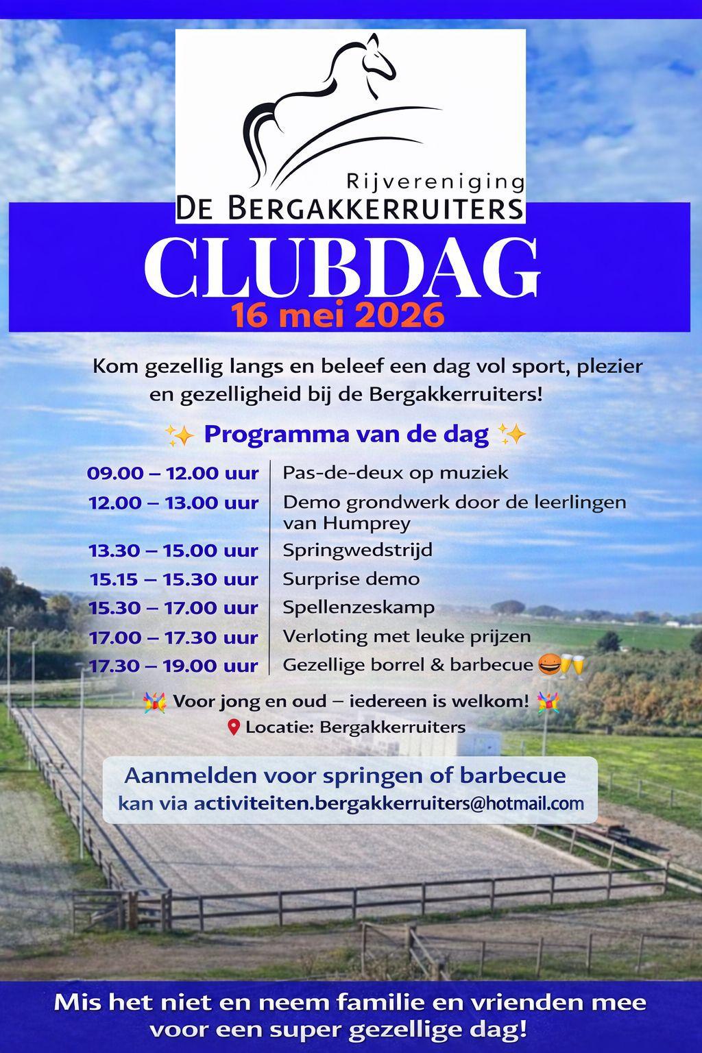 Wil je écht weten wie de Bergakkerruiters zijn? Dan moet je op 16 mei in Est zijn, want onze jaarlijkse Clubdag is hét moment waarop alles samenkomt: gezelligheid, paardenplezier en een programma waar je blij van wordt. We trappen af met een...